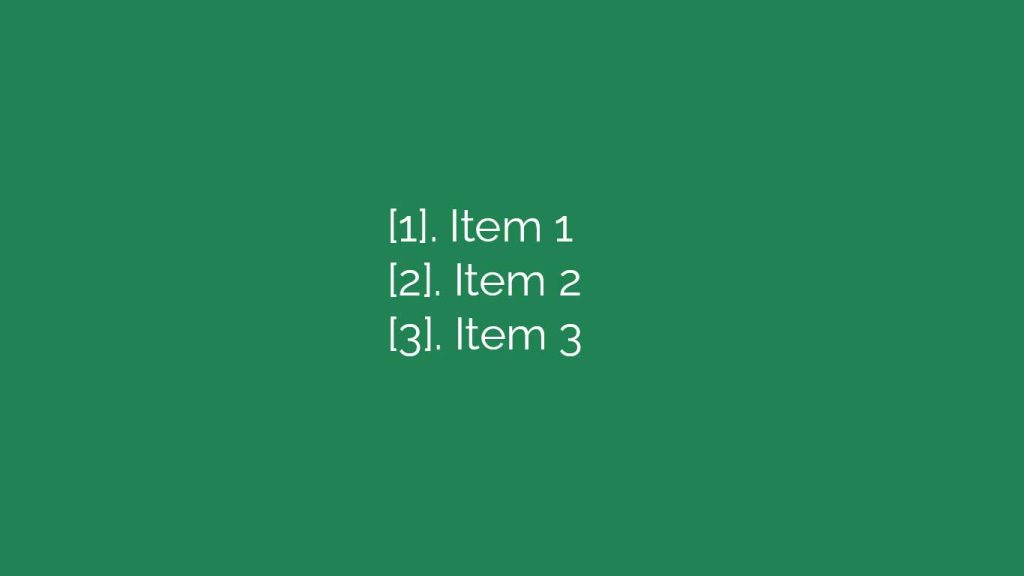 We can wrap ordered list items with square bracket using the code given below. Sometimes you may require it if you show a list of publications. We can replace [] with anything if we want.